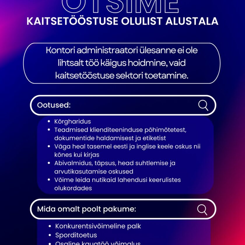 📩 Kandideerimiseks saada CV koos motivatsioonikirjaga aadressile: info@defence.ee
